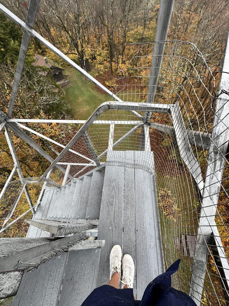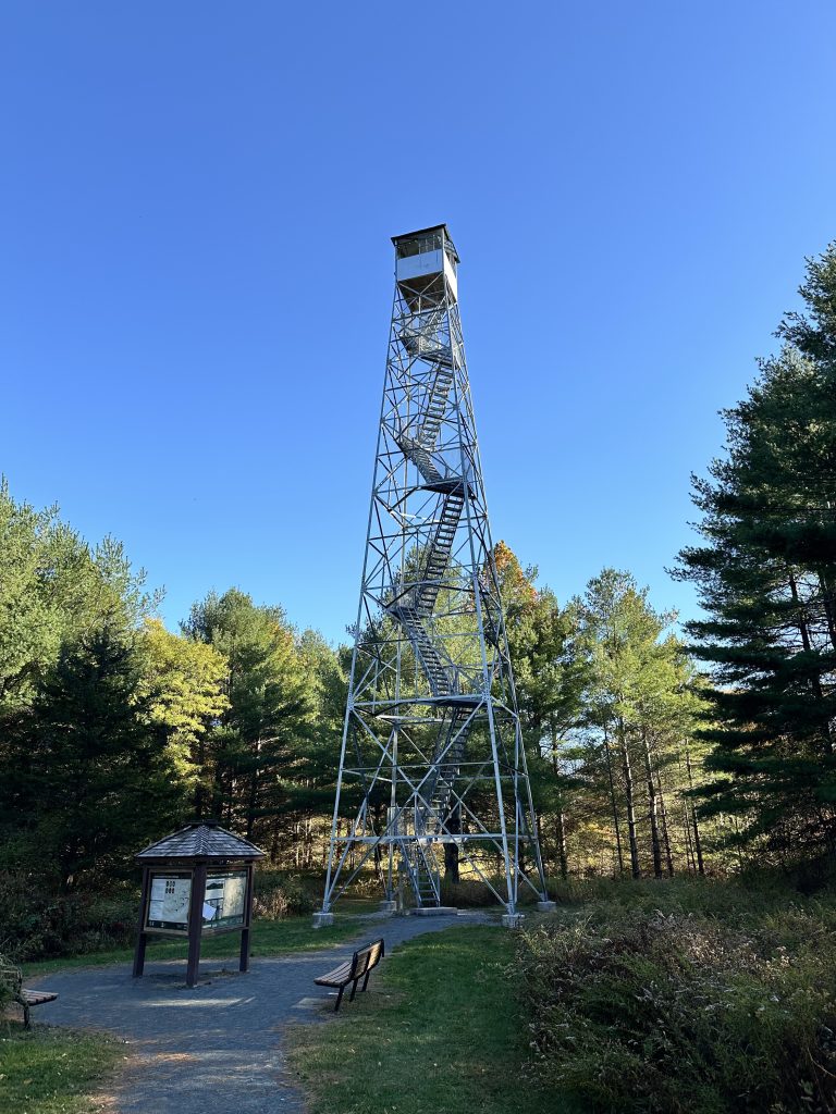 Two of the hikes I mention here feature fire towers—tall, steel structures rising above the trees. Built in the early 1900s, fire towers were used by forest rangers to spot wildfires before satellite surveillance existed. Rangers would climb into the cab (the little room at the top) and scan the landscape for smoke.