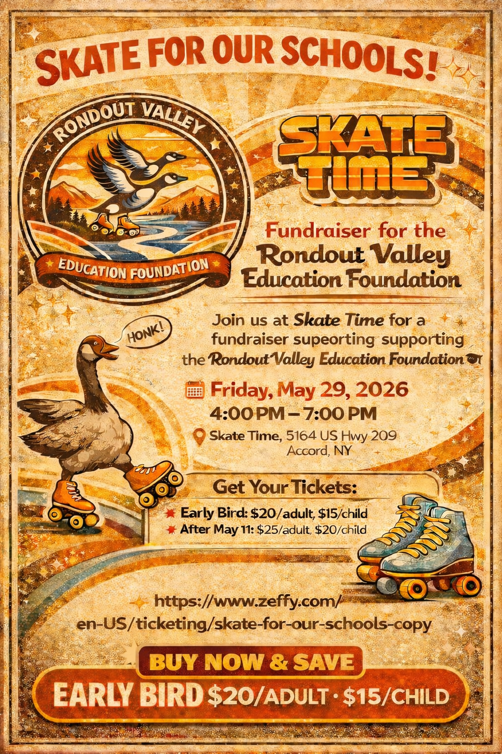 Skate Time 5164 US-209, Accord, NYJoin us for the Skate for Our Schools Fundraiser at Skate Time—a fun-filled community event supporting local students and programs through the Rondout Valley Education Foundation. Enjoy an exciting evening of roller skating, music, and family-friendly entertainment while making a meaningful impact. Proceeds help fund grants, opportunities, and experiences that benefit students, classrooms, and school […]