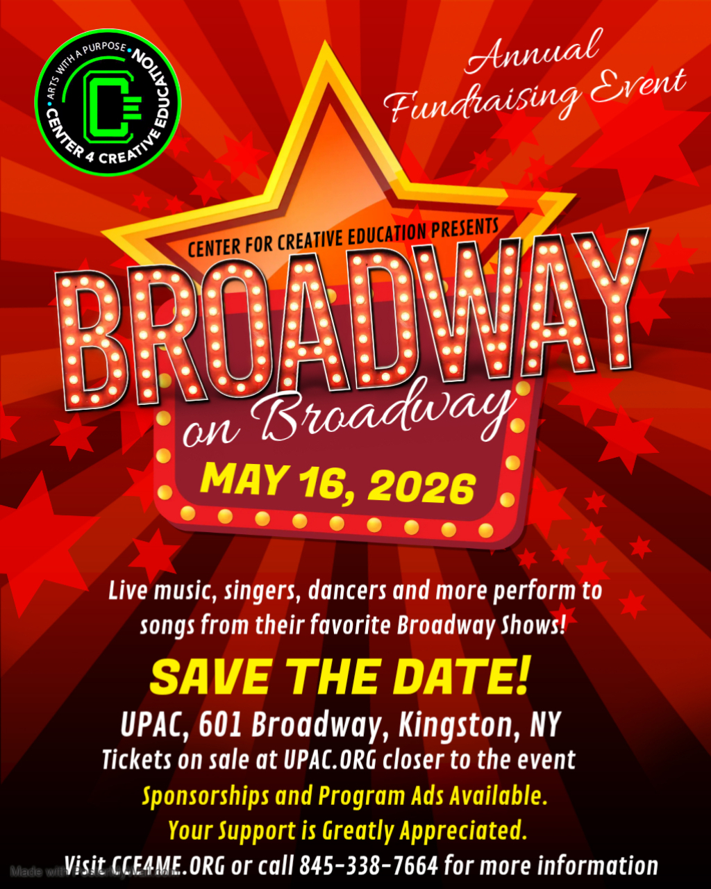 May 16 “Broadway on Broadway” CCE’s Annual Recital 5:30 pm - 8:00 pm UPAC 601 Broadway, Kingston Event Details Get Directions